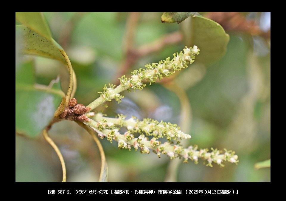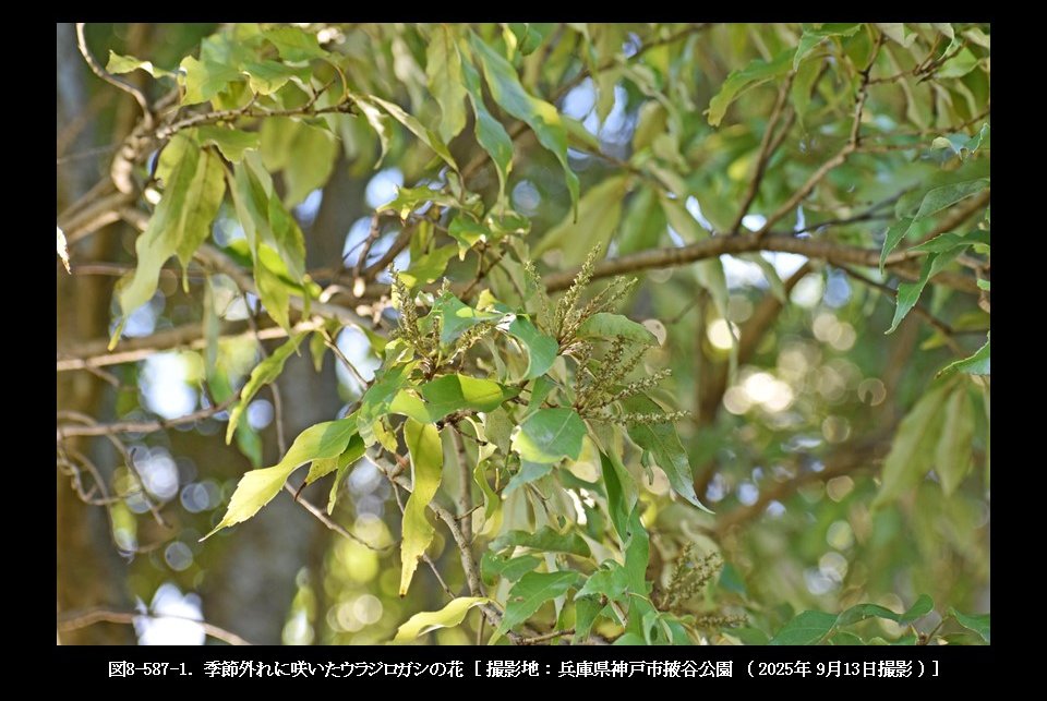 一方、2024年5月に、この個体に隣接した別のウラジロガシで、前年の秋に開花したと思われる花序の残滓を見つけました(***)。そこで、この個体についても先の個体と併行してチェックを続けてきたところ、今年の9月に待望の花が咲いたのです(図8-587-1参照)。