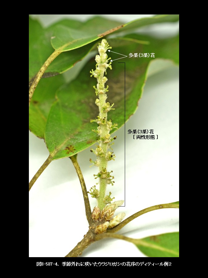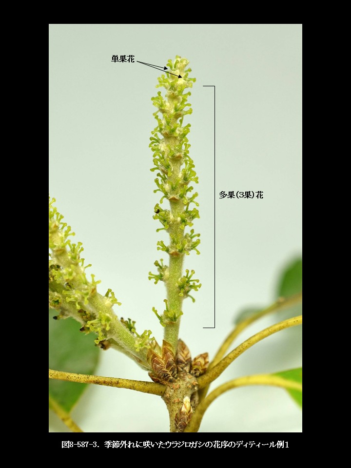 これらの枝から採取した花のディーティールを図8-587-3、図8-587-4に示します。花軸は、春に咲く通常のものよりも長く、最長で60mmぐらいありました。また、そこに咲いた雌花序(両性花序)は、多いもので30個以上ありましたが、春に咲くウラジロガシの花軸との決定的な違いは、雌花序のほとんど(もしくは全て)が多果(3果)で、単果は咲いても花軸の先端付近に数個しか見られなかったことです。