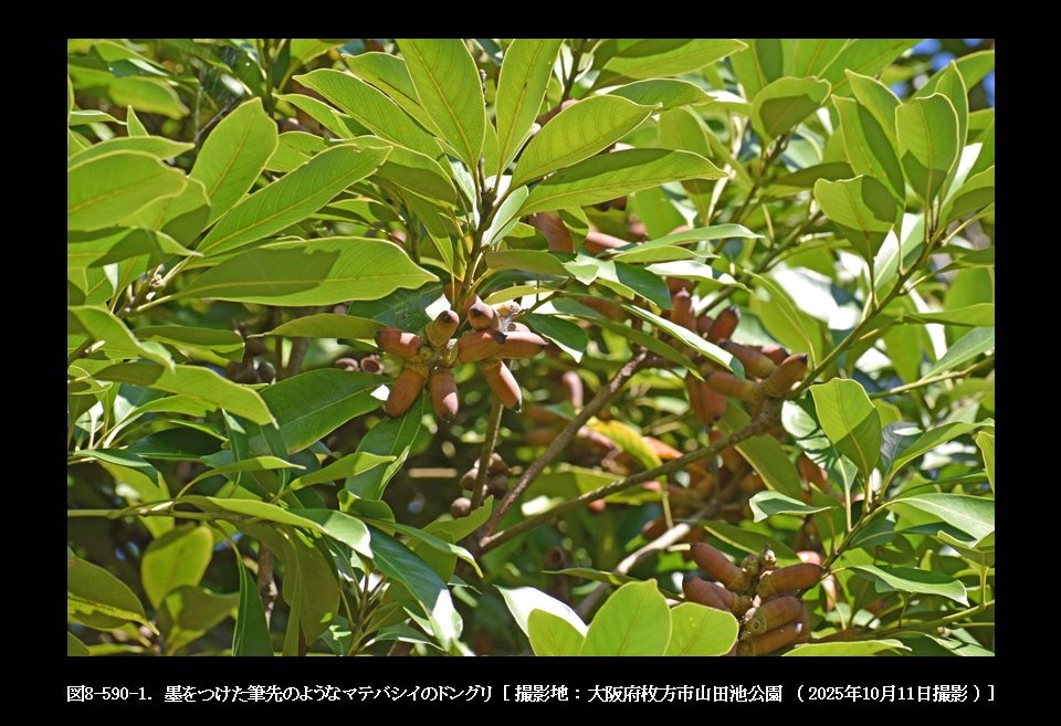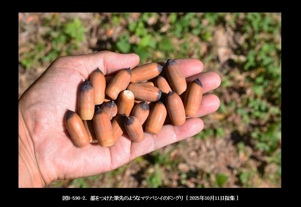 山田池公園 [ 所在地 : 大阪府枚方市 ] にあるマテバシイの林で、ちょっと変わった模様のドングリを見つけました(図8-590-1参照)。