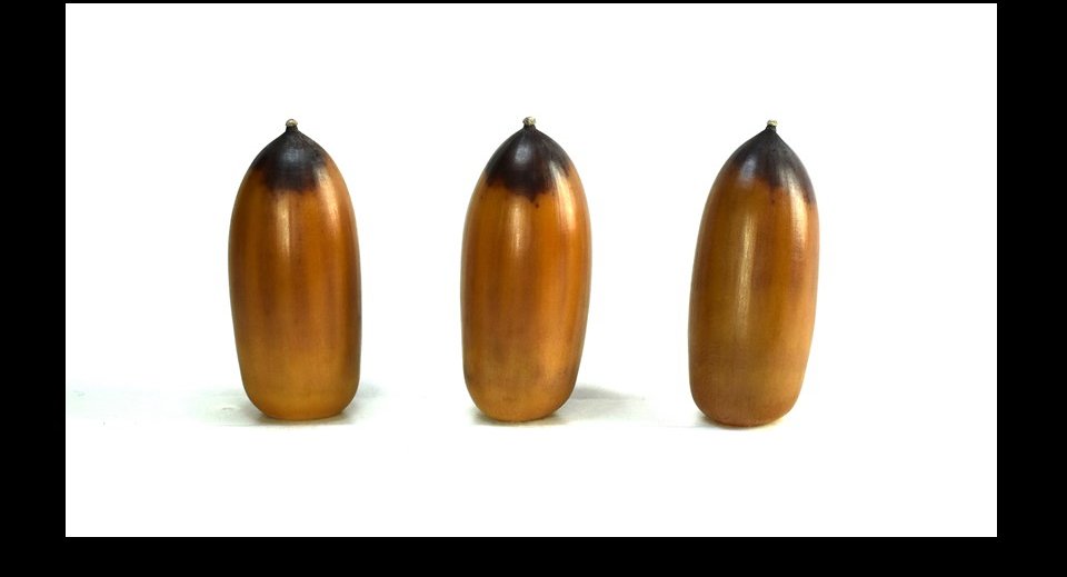 マテバシイのドングリは、黄土色やオレンジ色の単色のボディに、一風変わった不規則な模様があるものをしばしば目にします(*)。この秋、マテバシイのドングリを採集に出掛けて、変わった模様のあるドングリを見つけたら、ぜひ私にも紹介してください。