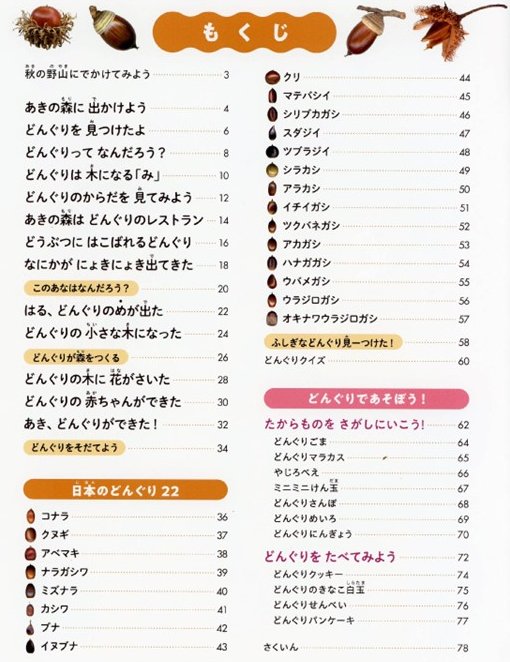 具体的な内容としては、各種国産ドングリの紹介だけでなく、ドングリの成長過程や動物との共生関係まで、子供たちが知りたいと思われるドングリに関するすべてが盛り込まれています。また、ドングリを使った料理や遊び方まで、子供といっしょに大人も楽しめるものになっています。
