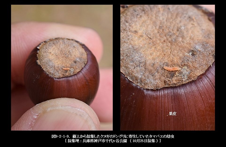 一方、図9-2-1-2は、マテバシイの樹下に落ちていたドングリから殻斗を取り外した時に現れたタマバチの幼虫です。このドングリの中には、18匹もの幼虫がいました。マテバシイのドングリに寄生したタマバエの幼虫は、ほとんどが樹上に結実したドングリの中から見つかっており、落下したものから現れたのはこれだけです。このドングリは、殻斗と堅果が強固に癒着しており、ドングリが完熟前の状態よりも両者を分離するのにかなりの力を要しました。