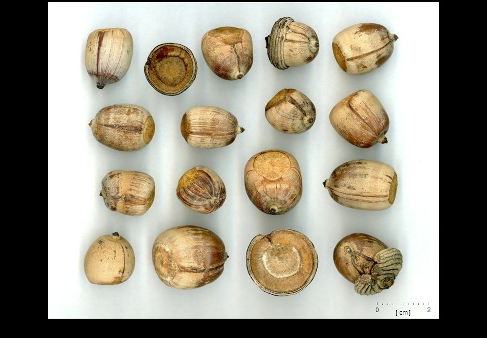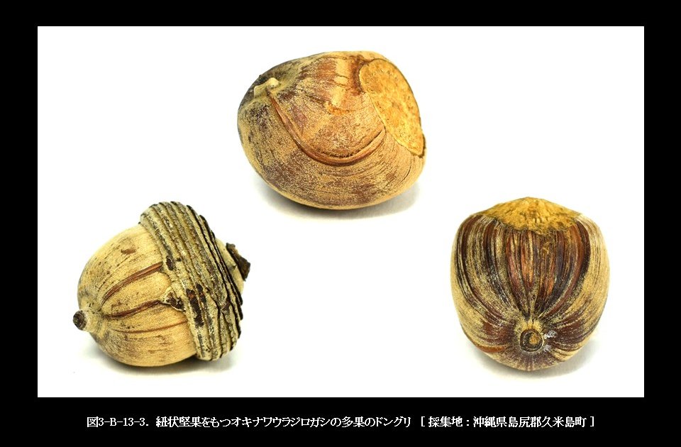 沖縄県の久米島で採集したオキナワウラジロガシの多果です。図3-B-13-1は、全て2果のドングリです。中央ににある上下の殻斗は、同じものを別の角度から撮影したものです。