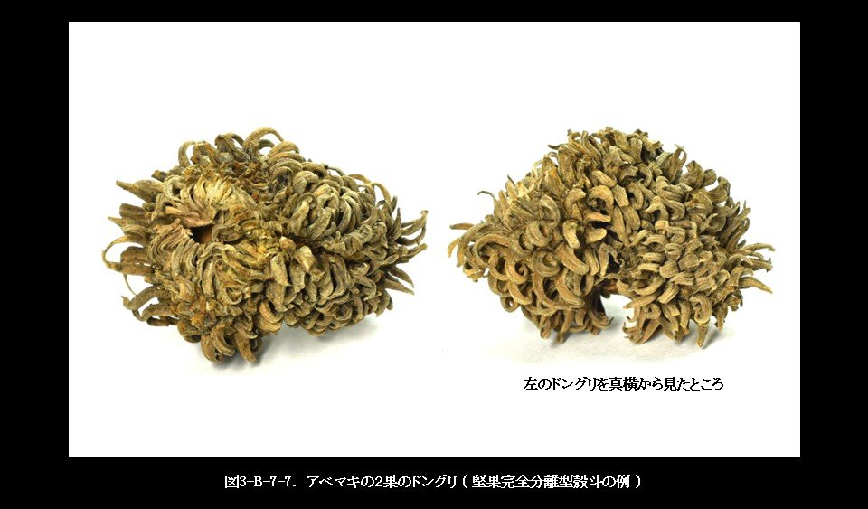 多果の形態は、主に1つの殻斗が複数の堅果をまとめて包含する堅果統合型殻斗(図3-B-7-3参照)で、いずれも殻斗が包含する複数の堅果は合着しています(図3-B-7-4参照)。中には、複数の堅果がほぼ完全に合着して、首が一つに統合されたものもあります(図3-B-7-5参照)。