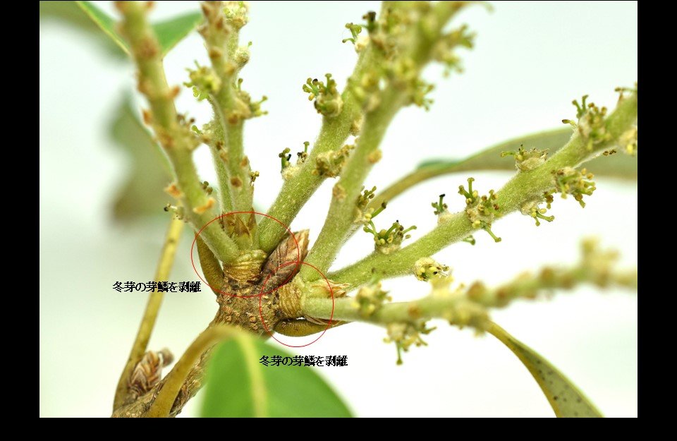 極端に短い新枝に、雄花序や雌花序、あるいは両性花序から成る穂状の花軸が複数本現れたものについては、ウラジロガシとコナラで確認しています。図30-3-1は、花軸が出現したウラジロガシの2つの冬芽の芽鱗を剥離したところです。極端に短い新枝に、各々3本の花軸が立つ様子が判ります。