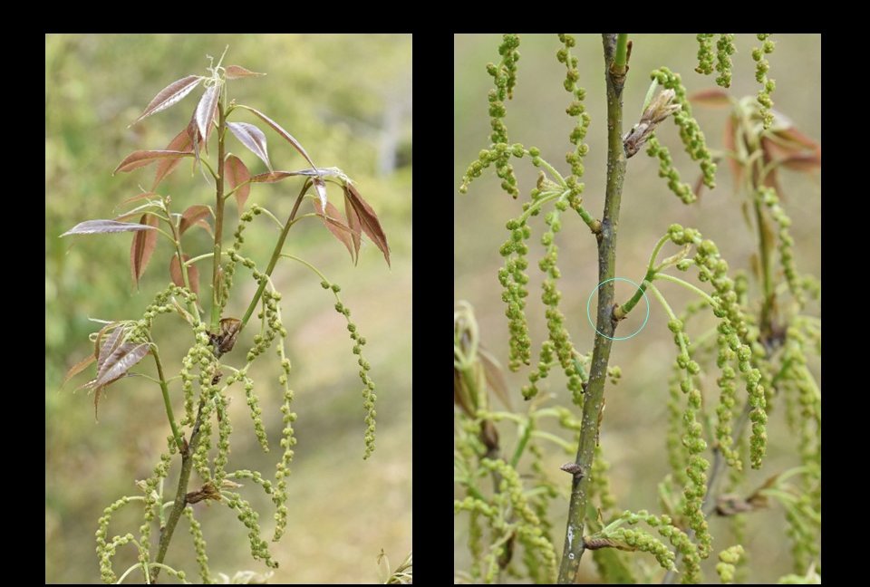 その次の段階として、図30-3-1の状態から徐々に新枝が伸長します。以下に、伸長したコナラの新枝に2本の花軸が立ったもの(図30-3-2参照)、4本の花軸が立ったもの(図30-3-3参照)、そしてたくさんの花軸が立ったもの(図30-3-4〜5参照)の例を示します。