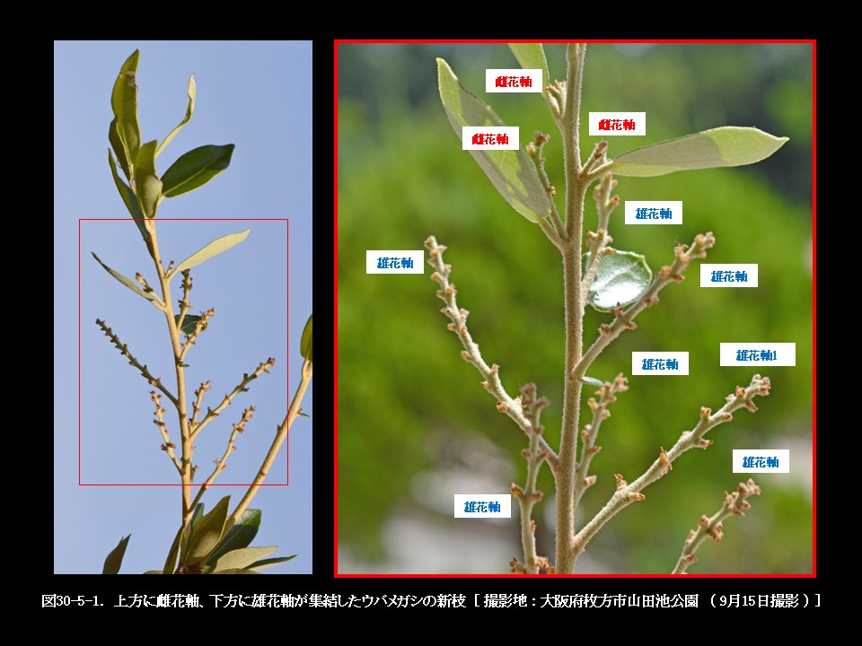 冬芽や普通葉が出現した花軸専用の新枝に立つ穂状の花軸の中で、主に雌花序から成る花軸が上方に、そして主に雄花序から成る花軸がその下方に集結したものについては、ウバメガシで確認しています(図30-5-1〜図30-5-2参照)。