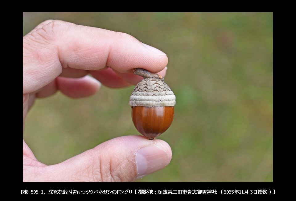 今年は、それらの中で一番と言ってもいいぐらい立派な殻斗をもつ太っちょドングリ(図8-595-1参照)が大豊作で、樹上にはいつにも増してたくさんのドングリが結実していました(図8-595-2参照)。