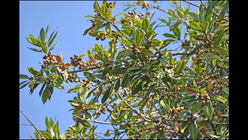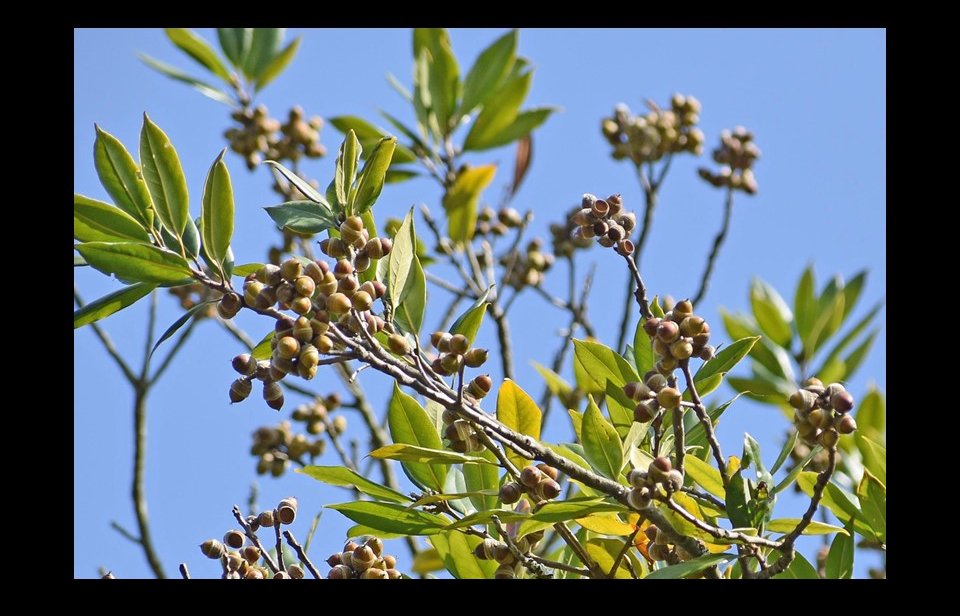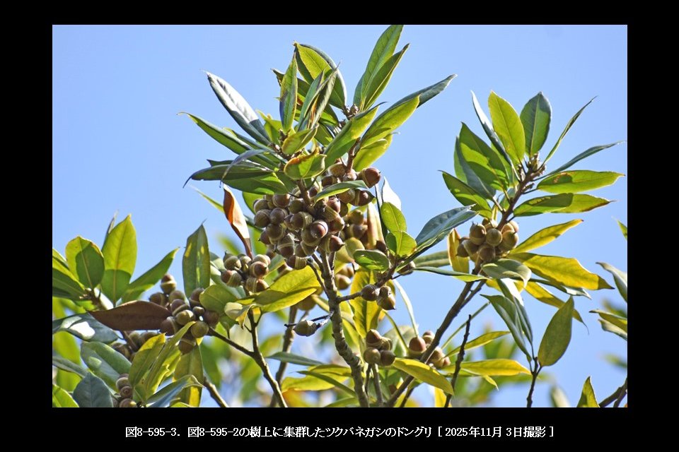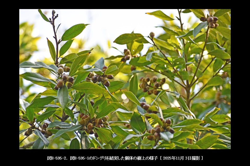 このように枝の特定箇所にドングリが群集した様子は、シラカシやアラカシの樹上では珍しくありませんが、ツクバネガシでは小粒のドングリを結実する個体を除くと、あまり見かけません。とりわけ、図8-595-3はこの個体の現状を象徴する一枚です☆