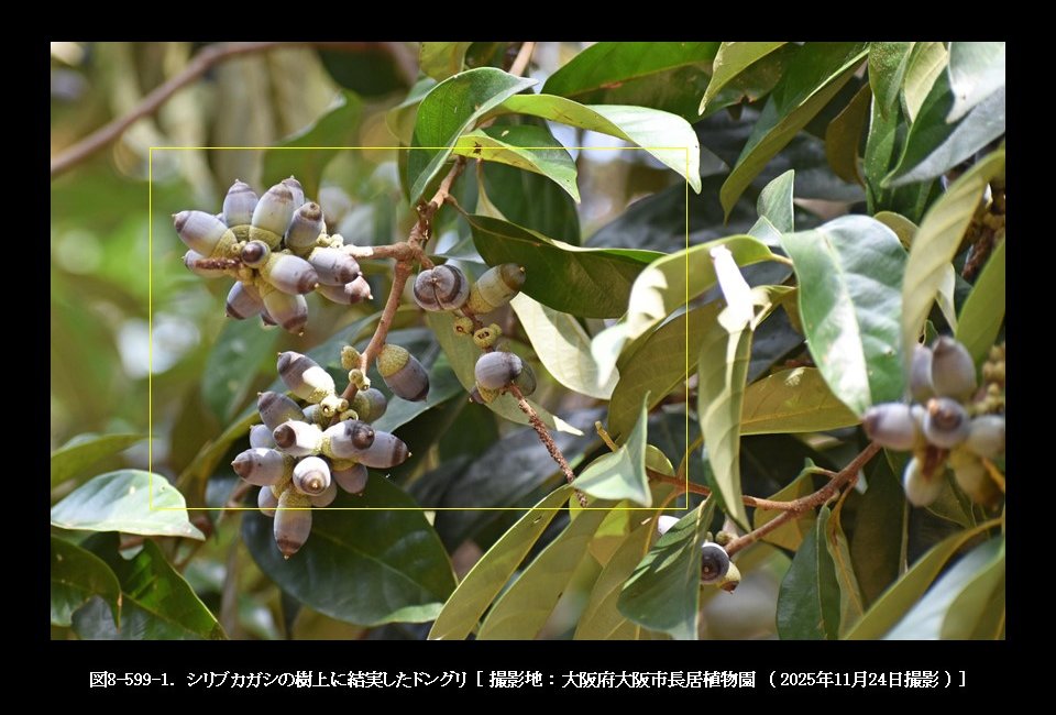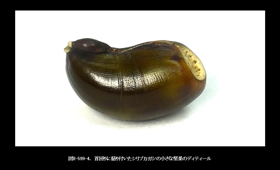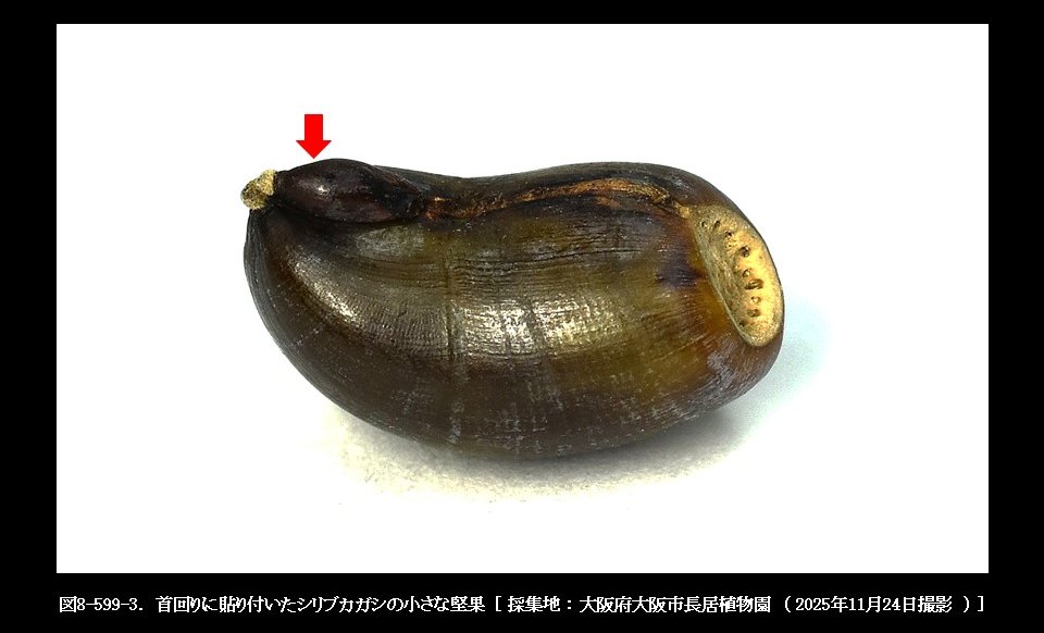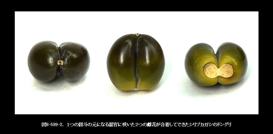 さて、コナラ属の多果ドングリと同様に、マテバシイ属でも複数の堅果が合着したドングリには様々な形態があります(図8-599-2参照)。それらの中でも極めつけの変わり種を、先日長居植物園 [ 所在地 : 大阪府大阪市 ] にあるシリブカガシの林で見つけました。それは、シリブカガシの堅果の首回りに、もう一つの小さな堅果が貼りついた2果のドングリです(図8-599-3参照)。