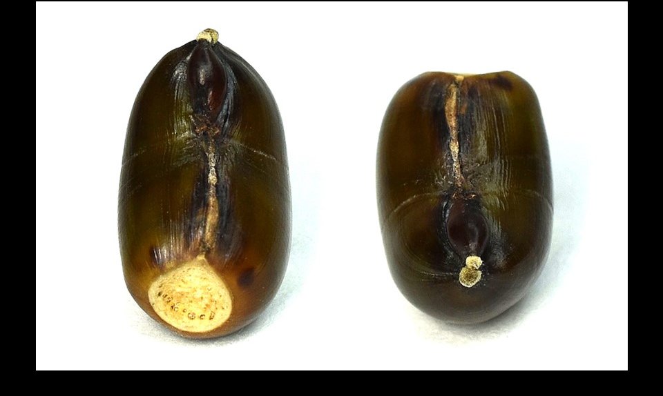 ただ、この小さな堅果には、へそと呼べるようなものが見当たりません(図8-599-4参照)。たぶん、成長が停止した時点で、この堅果に養分を供給してきた維管束のパスが遮断されてしまったからでしょう。これまで様々な種類の多果を検分してきましたが、こんなドングリを見たのはこれが初めてです☆